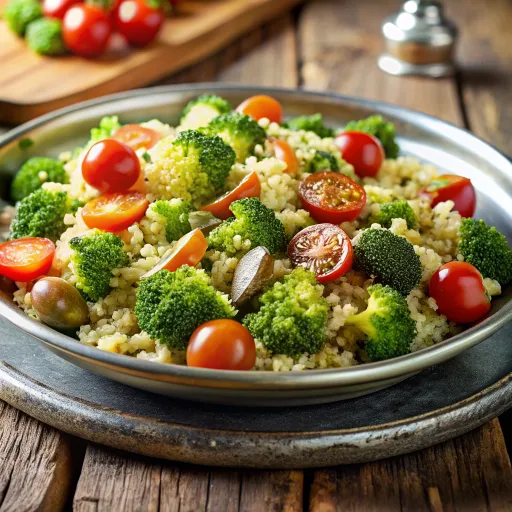 A delightful combination of creamy avocado and tender broccoli atop nutty quinoa, dressed with a tangy lemon tahini sauce.